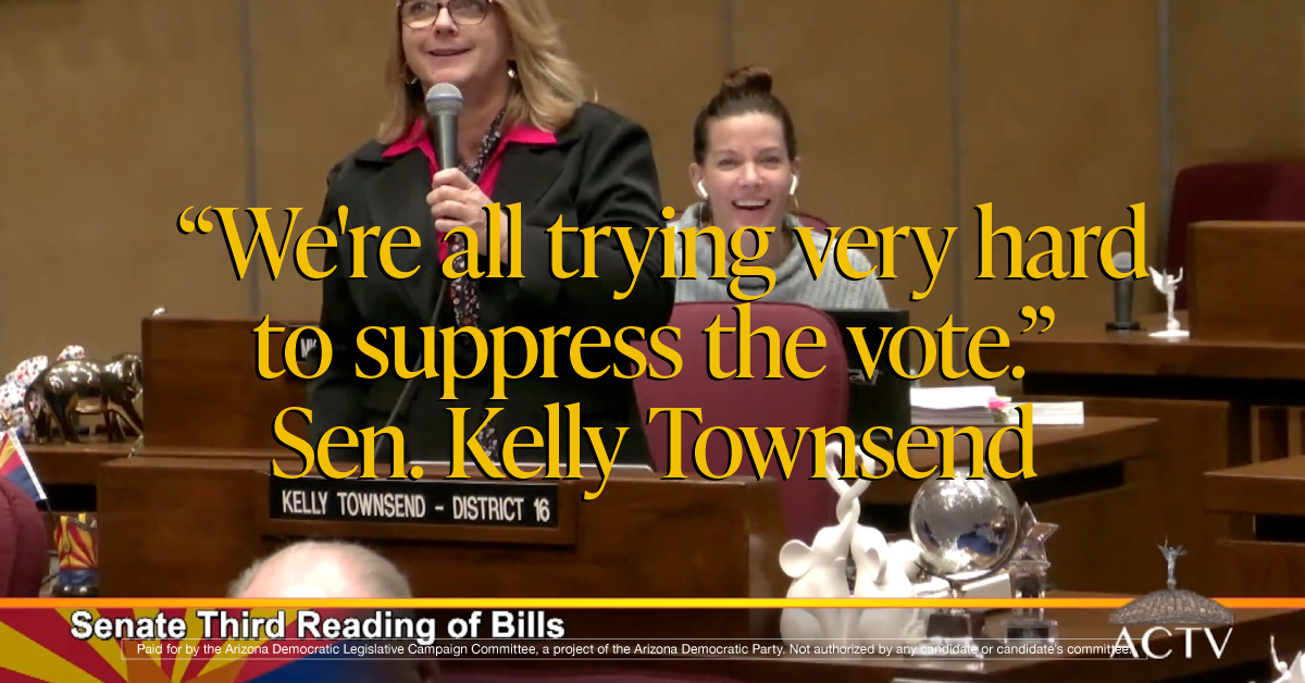 This legislative session, Republicans have used their power to introduce over 100 anti-democracy election bills and Senator Kelly Townsend just said the quiet part out loud on the Senate floor. While explaining her yes vote to another bill that suppresses our freedom to vote, Sen. Townsend said, “we’re all trying very hard to suppress the vote.”