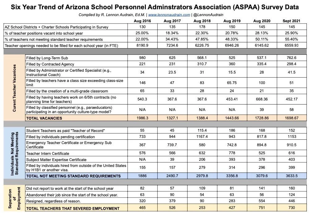 The Arizona School Personnel Administrators Association published a new survey this week that found over 6,500 teacher openings that needed to be filled for this school year. One in four teaching positions remain vacant into the school year, and over half of those filling in the vacancies do not meet standard teacher requirements [1].